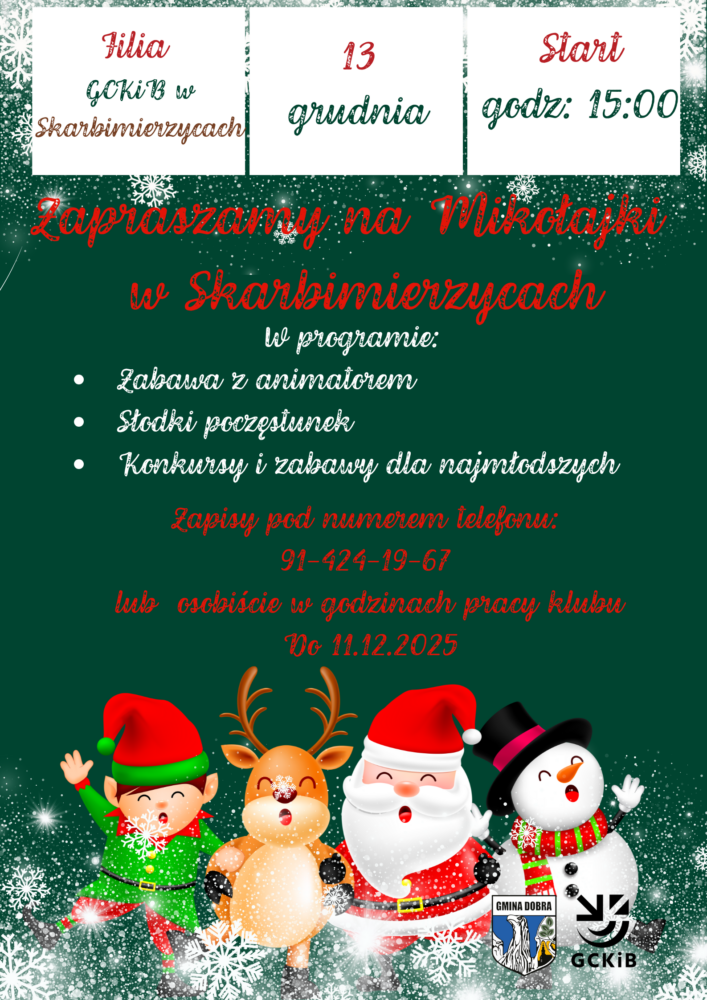 Już 13 grudnia o godz. 15:00 zapraszamy wszystkie dzieci na pełne radości i świątecznej magii Mikołajki w naszym klubie! ✨🎄 Zapisy do 11.12.2025 r. pod numerem telefonu: 91-424-19-67 lub osobiście w godzinach pracy klubu W programie czekają na Was:🎉 Zabawa z animatorem – dużo ruchu, śmiechu i wesołej energii!🍬 Słodki poczęstunek – małe co nieco, które doda wszystkim sił do zabawy!🏆 Konkursy i zabawy […]