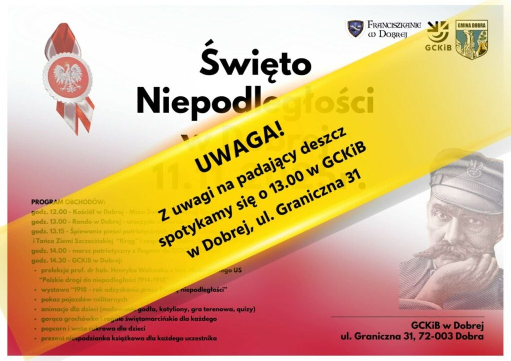 Szanowni Państwo, ze względu na dzisiejszą aurę po uroczystej mszy w Kościele w Dobrej, przenosimy się bezpośrednio do GCKiB w Dobrej.