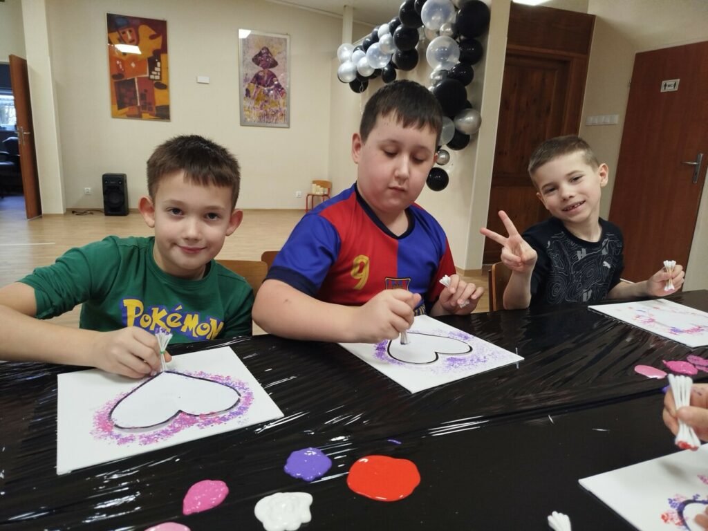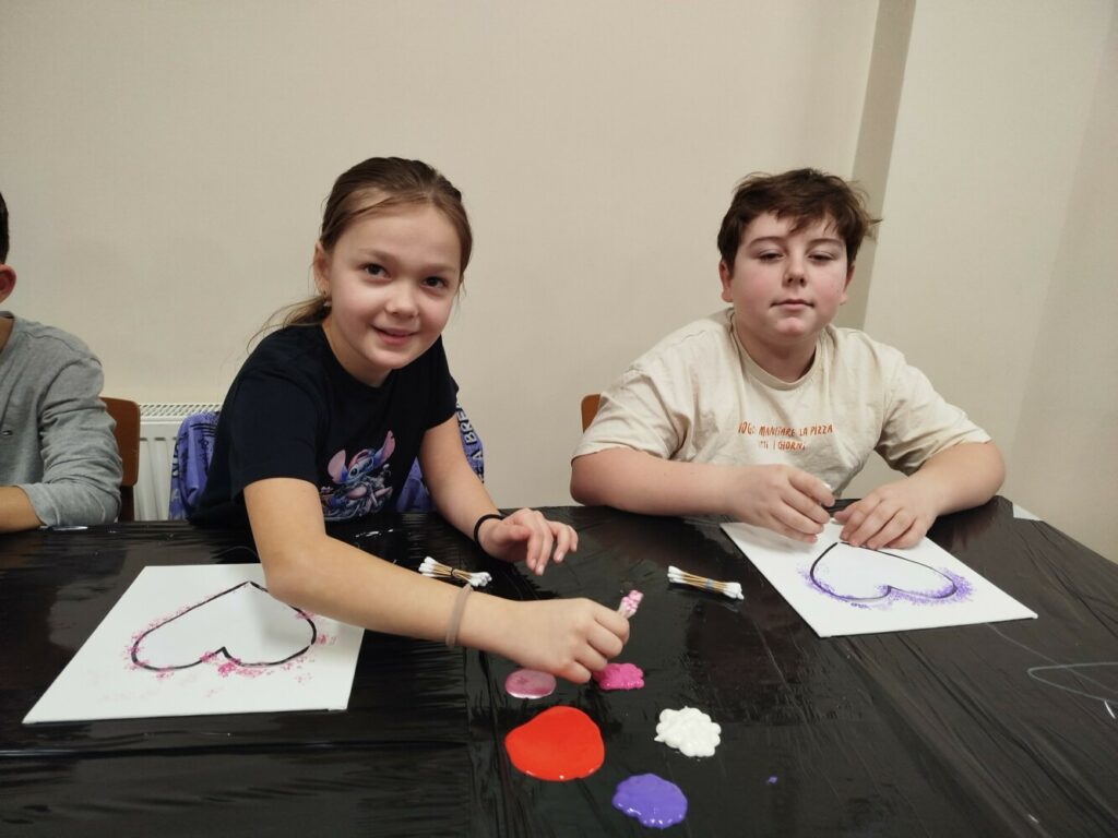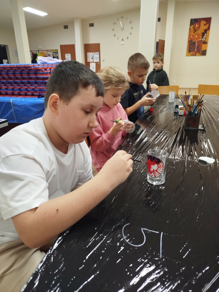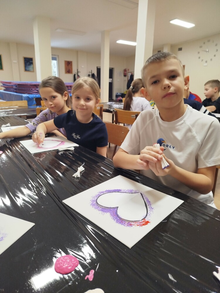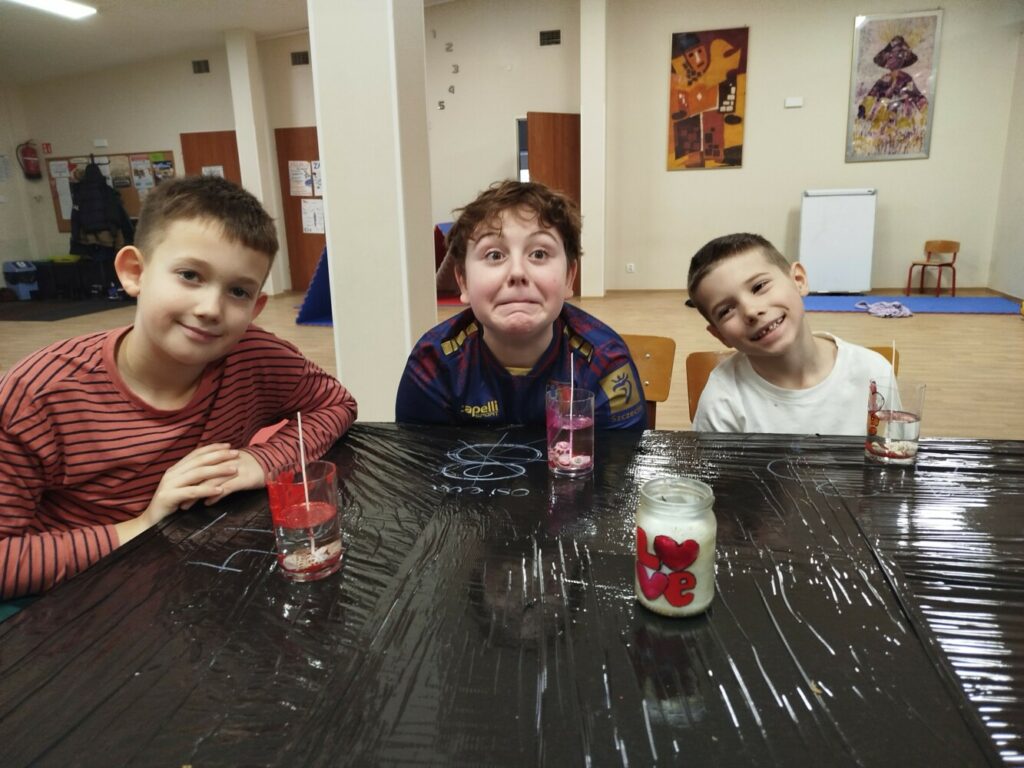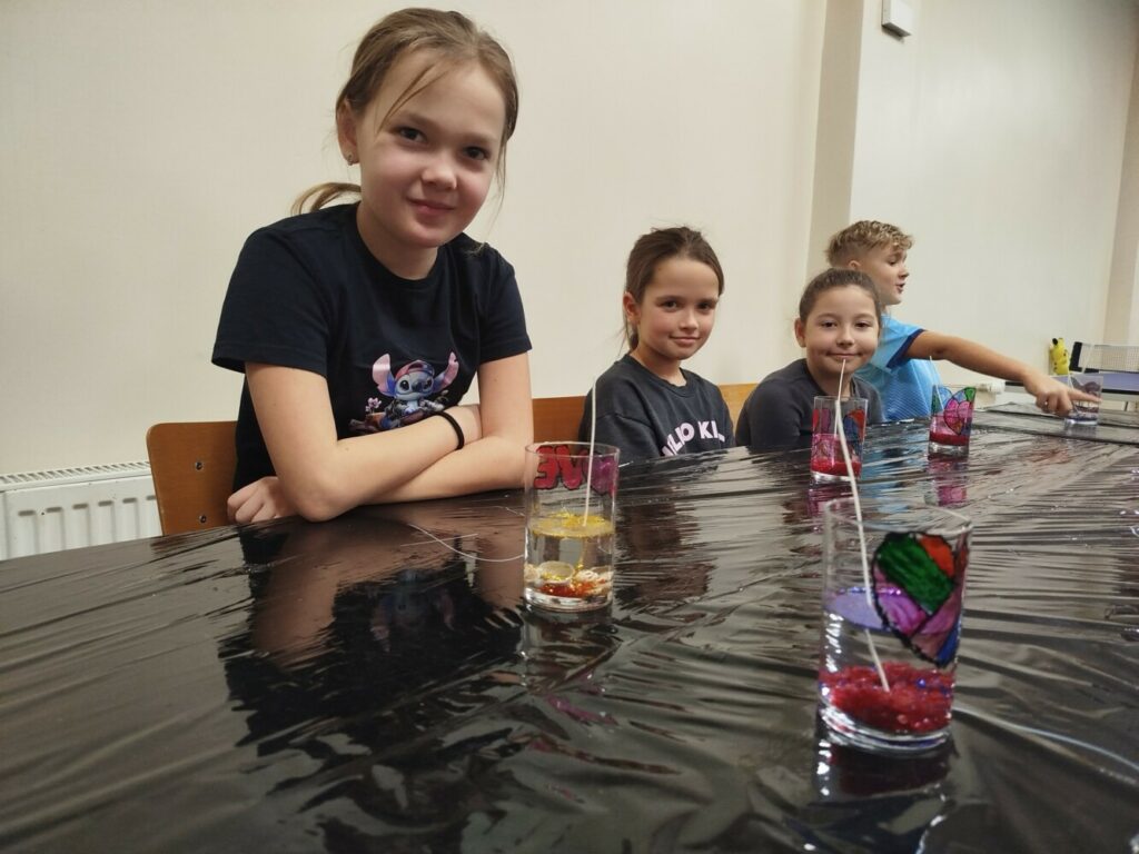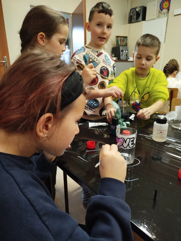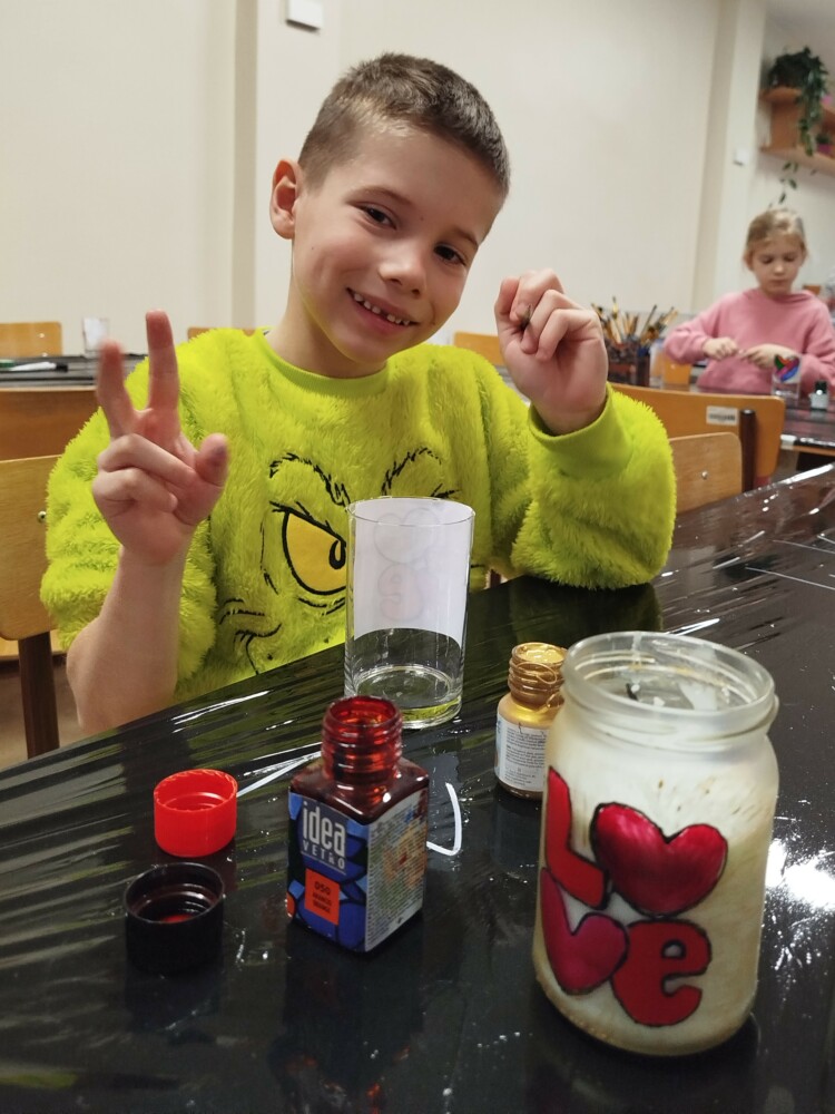 Podczas warsztatów rękodzielniczych w Klubie GCKiB w Dołujach powstawały wyjątkowe świece sojowe w szkle. Najpierw dzieci malowały naczynia farbami witrażowymi – pojawiały się serca, walentynkowe wzory i kolorowe kontury.
