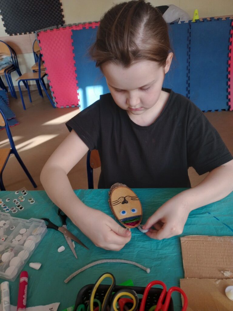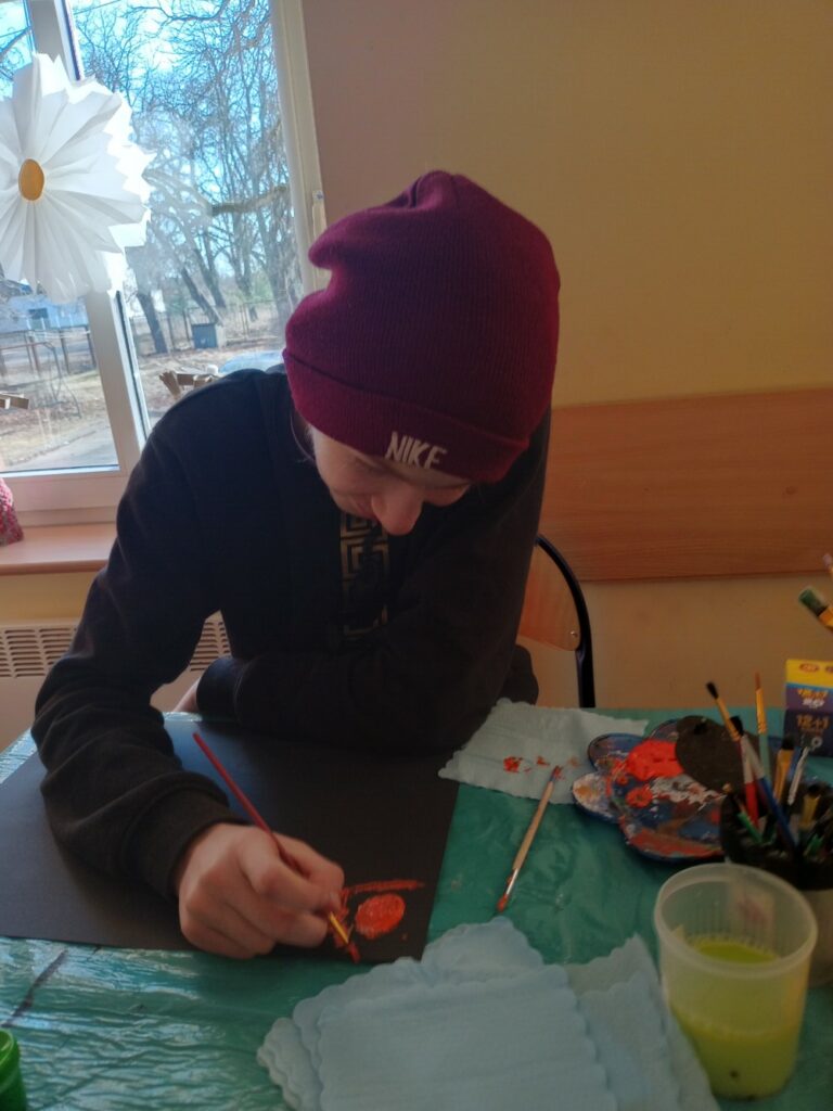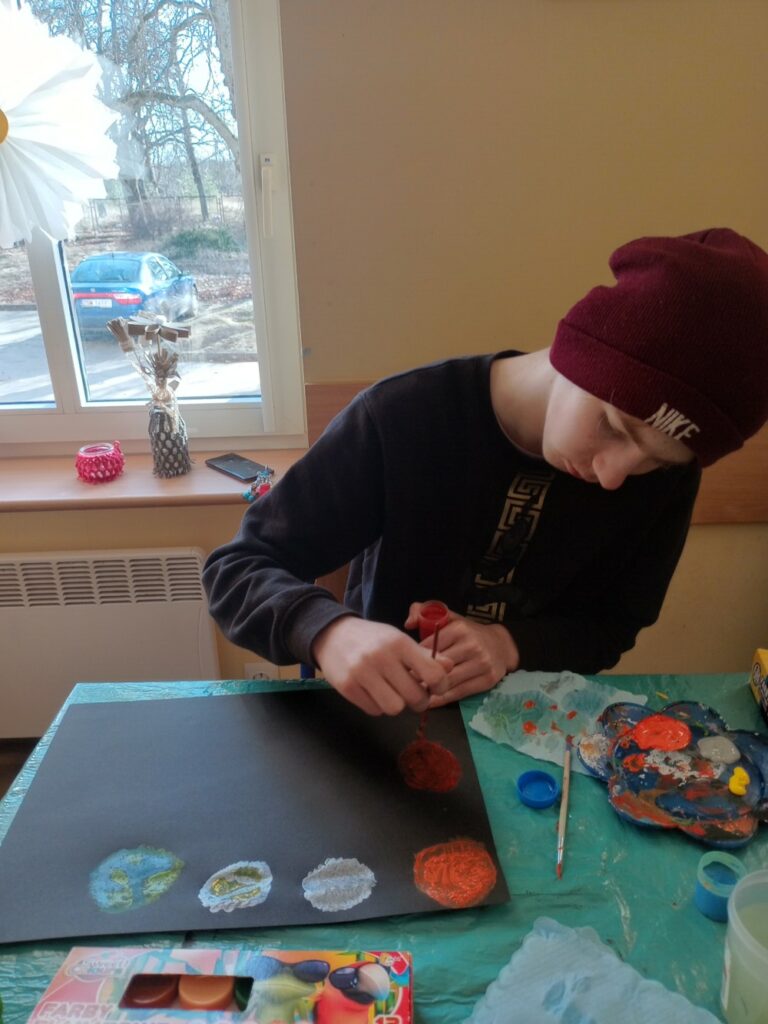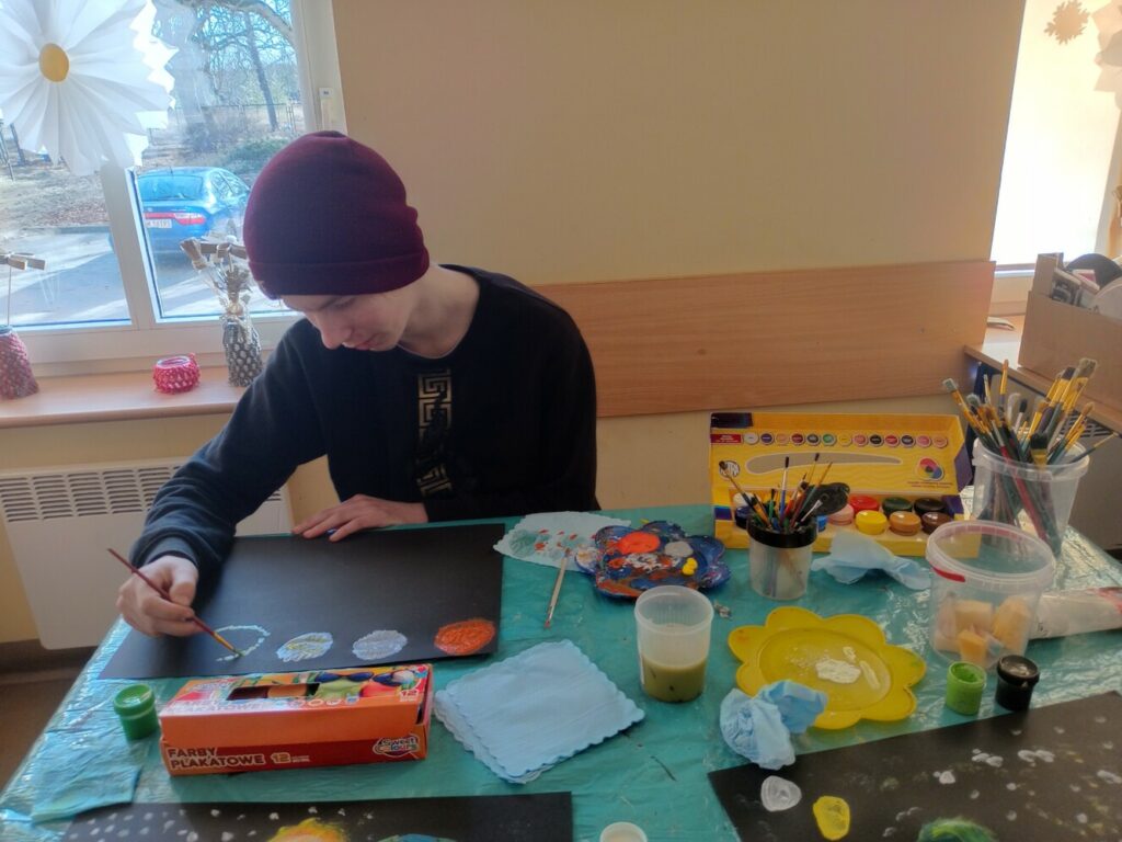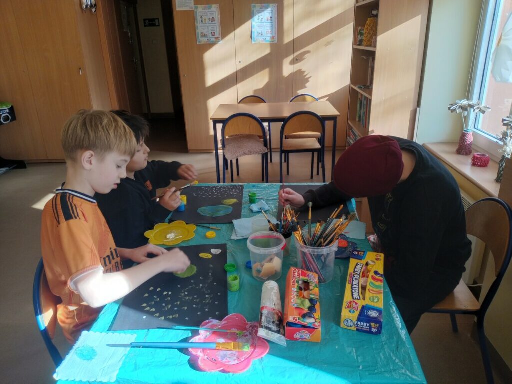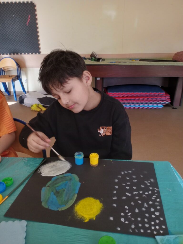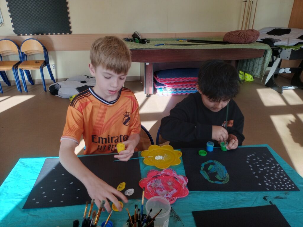 Powstały wielkanocne koszyczki z kubeczków papierowych 🐣, a także wyjątkowe, malowane prace „Kosmos moimi oczami” – pełne wyobraźni i kolorów 🌌🎨. Tworzyliśmy również kartki okolicznościowe z okazji Dnia Kobiet 💐, malowaliśmy ciekawe wzory oraz dekorowaliśmy drewniane zajączki 🐰.