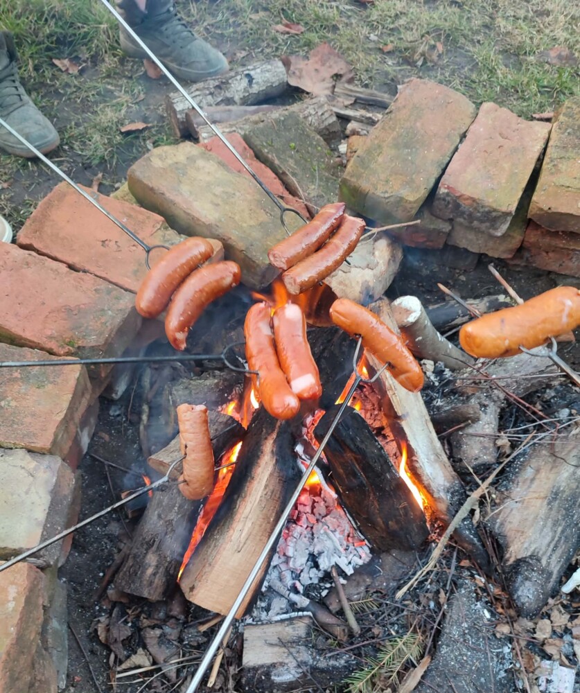 A po dobrze wykonanej pracy przyszedł czas na chwilę przyjemności – ciepła herbata i kiełbaski z ogniska smakowały wyjątkowo dobrze! 🔥☕😊