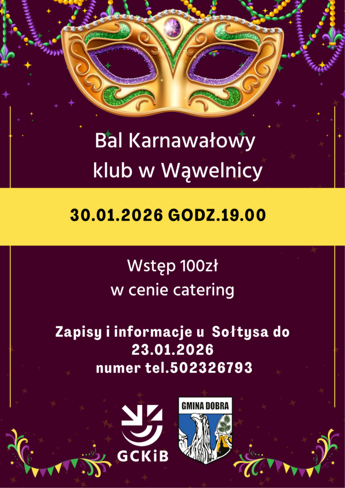 Serdecznie zapraszamy na Bal Karnawałowy, który odbędzie się w Wąwelnicy.