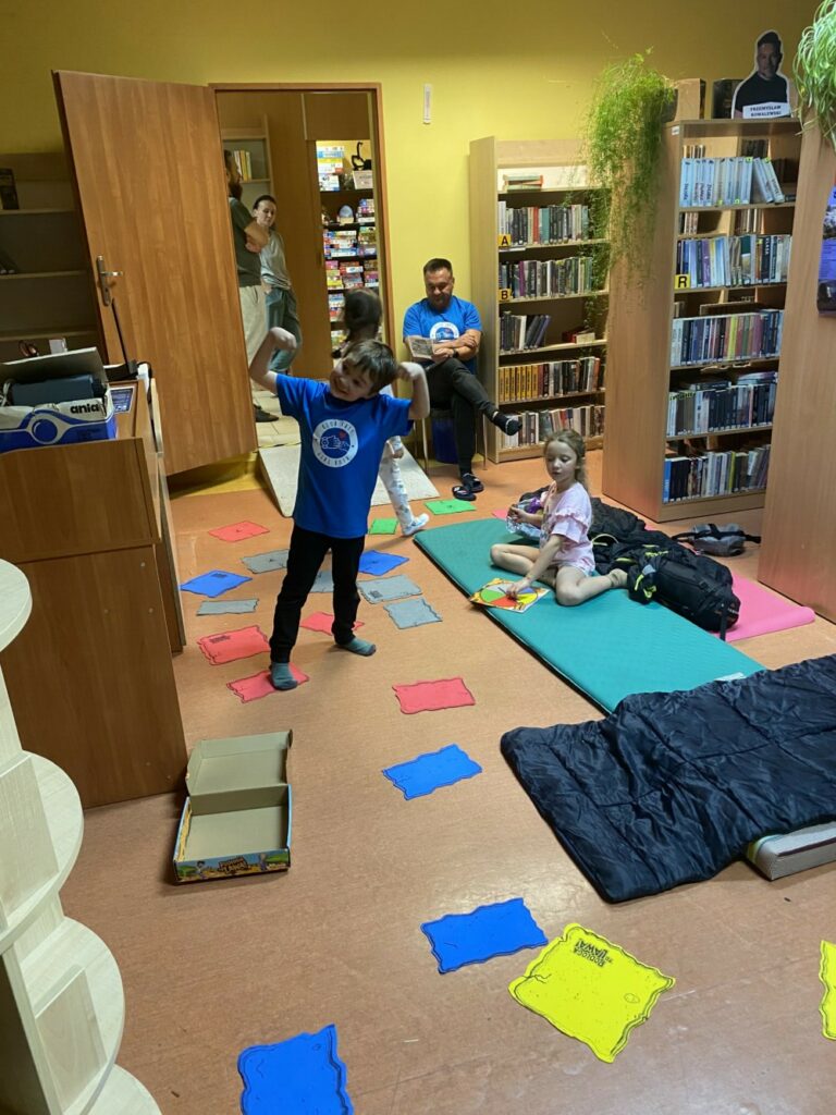 Co to była za noc! Nasza biblioteka zamieniła się w prawdziwy plac zabaw, kino i sypialnię w jednym. Tatusiowie wraz ze swoimi dziećmi wzięli udział w wyjątkowym spotkaniu Klubu Taty – nocnym czytaniu, spaniu między regałami, grach, rozmowach i wspólnej zabawie.
