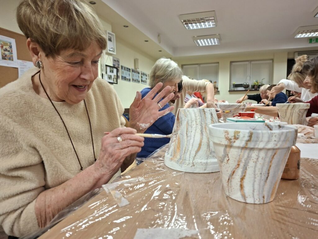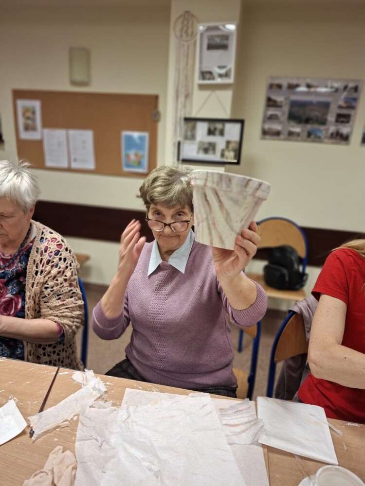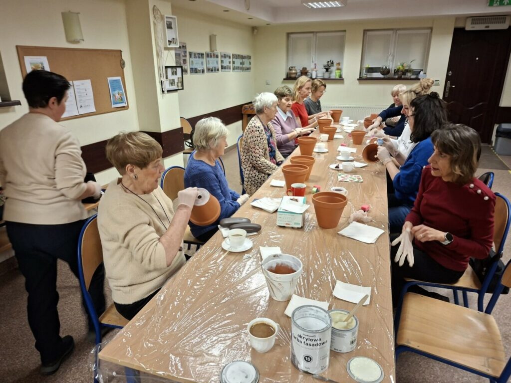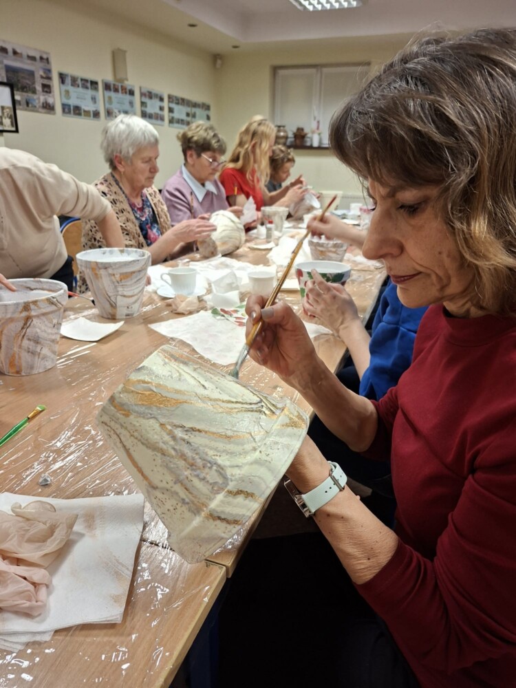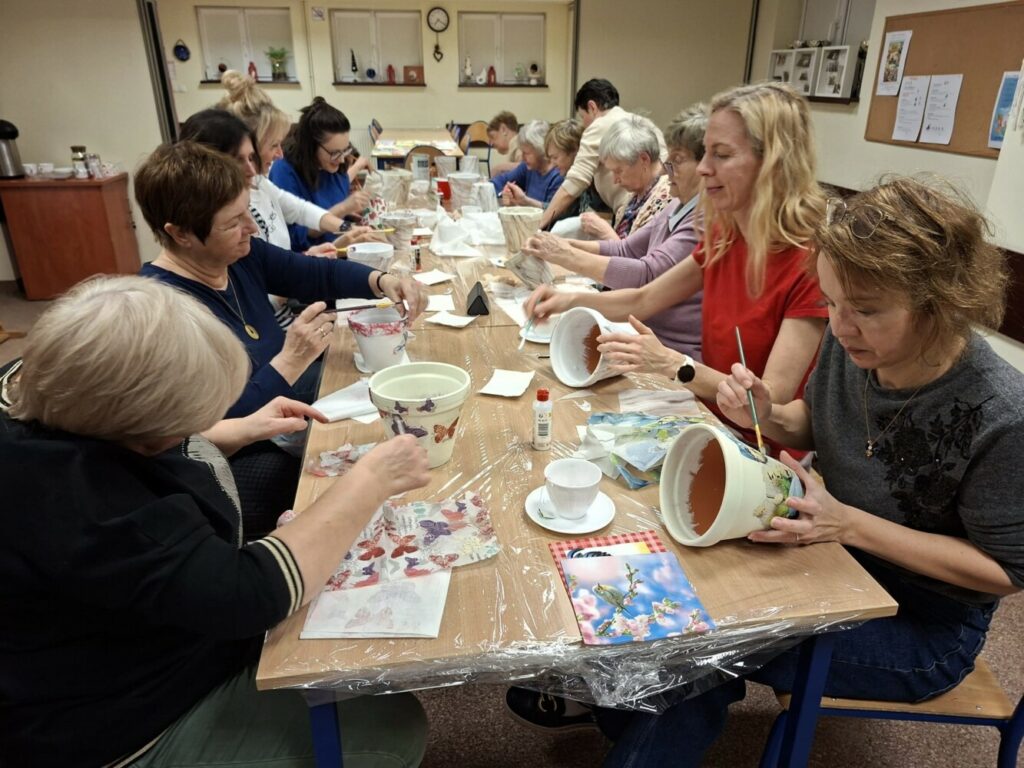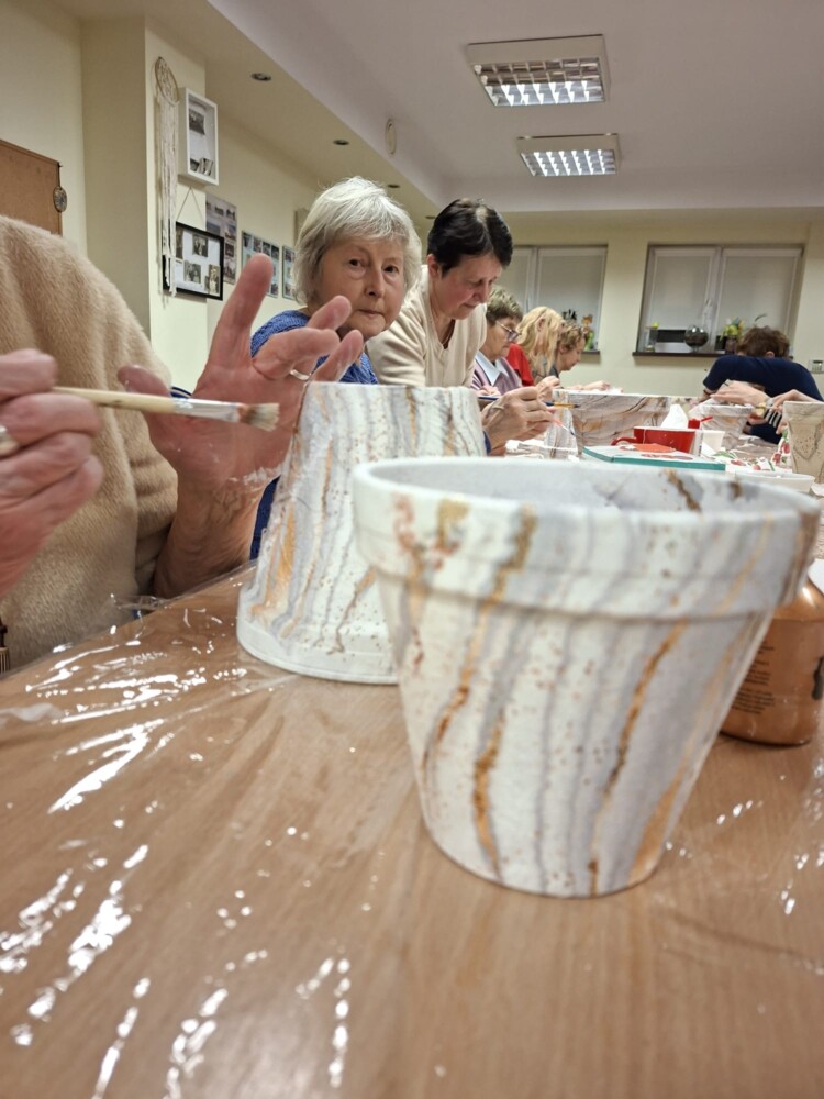 Podczas piątkowego spotkania dla dorosłych w klubie GCKiB w Bezrzeczu powstały przepięknie zdobione donice. Oprócz efektu marmuru panie wykorzystały również motywy świąteczne, czy roślinne, w zależności od potrzeb i fantazji.