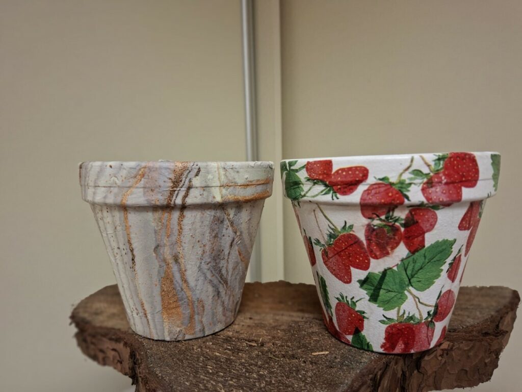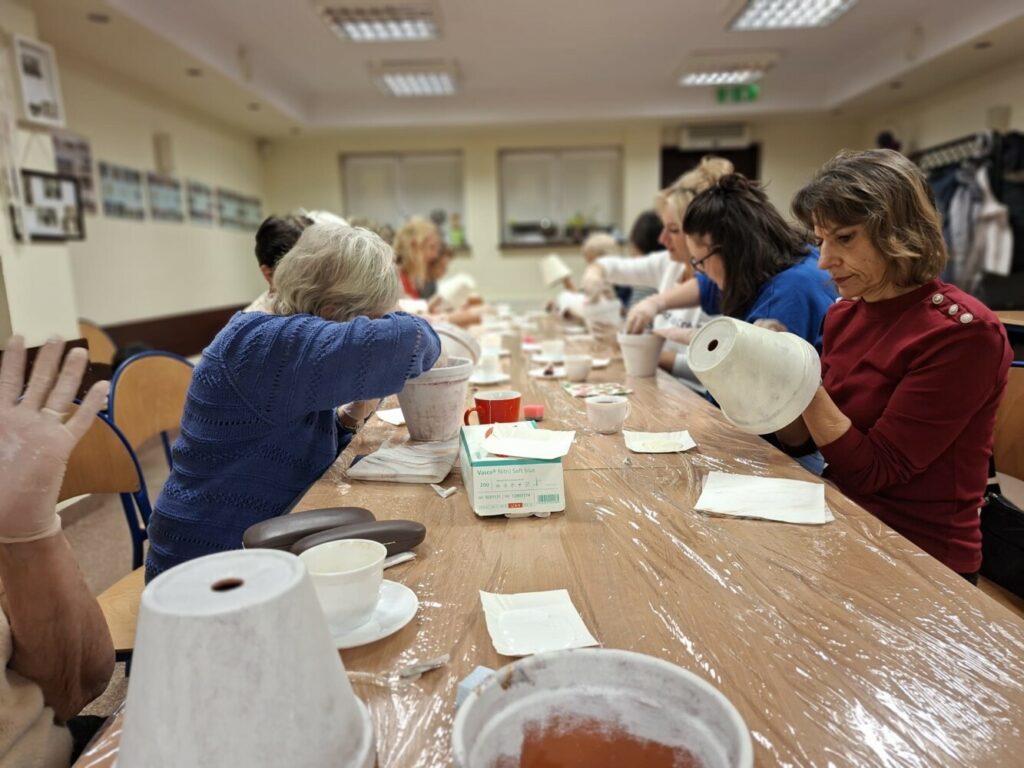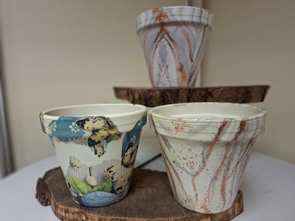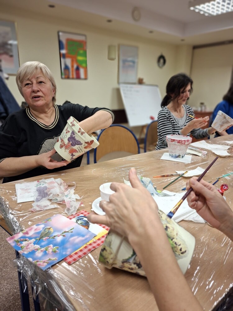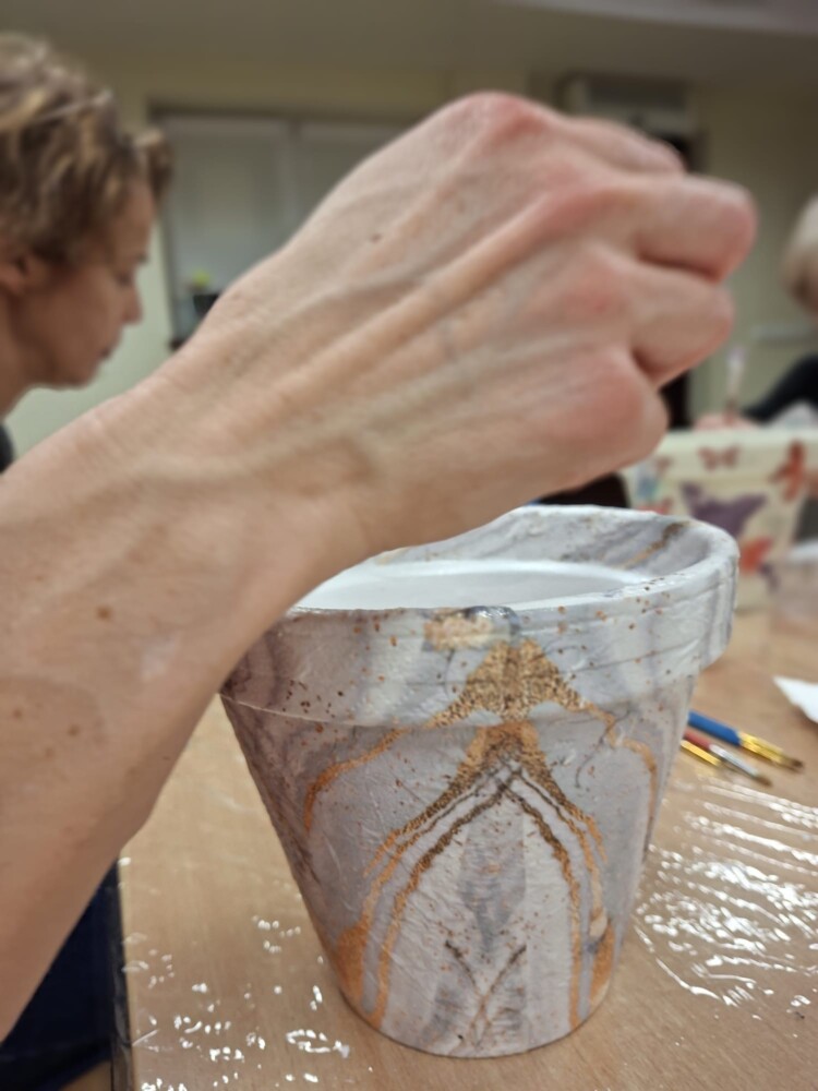 Podczas piątkowego spotkania dla dorosłych w klubie GCKiB w Bezrzeczu powstały przepięknie zdobione donice. Oprócz efektu marmuru panie wykorzystały również motywy świąteczne, czy roślinne, w zależności od potrzeb i fantazji.