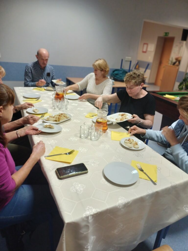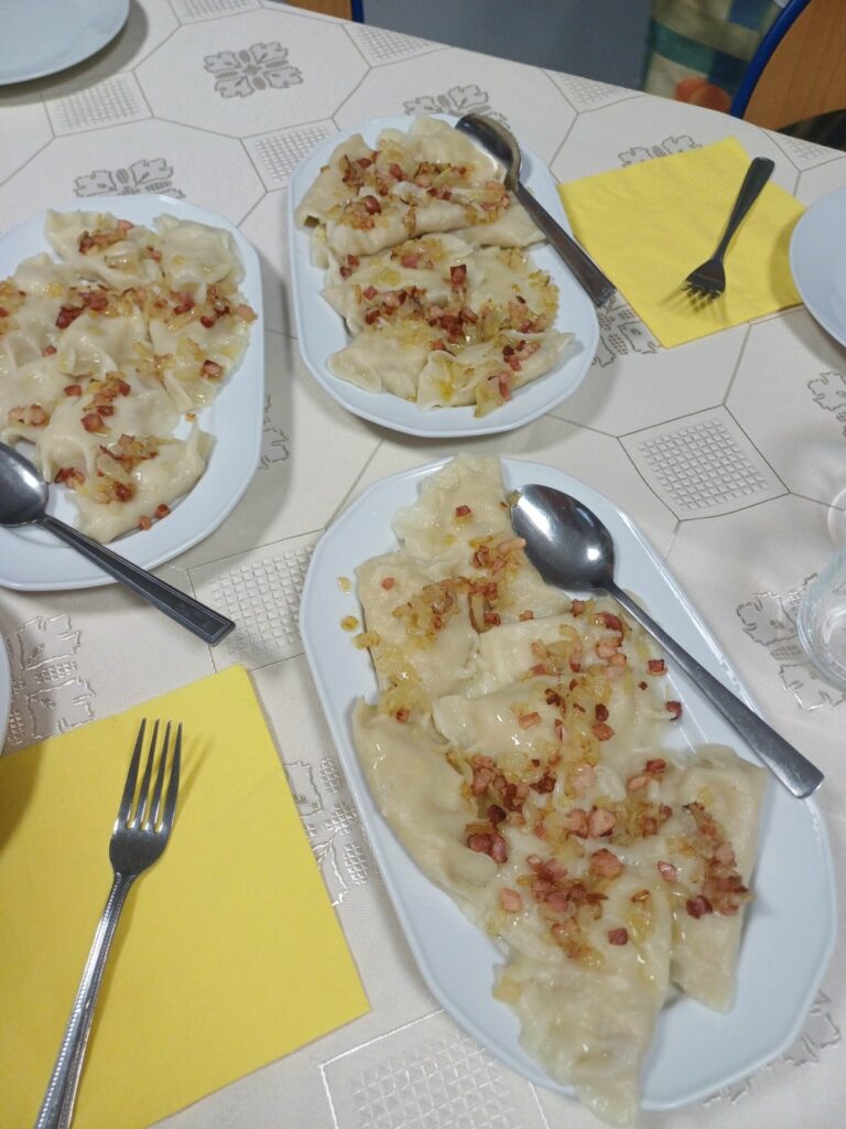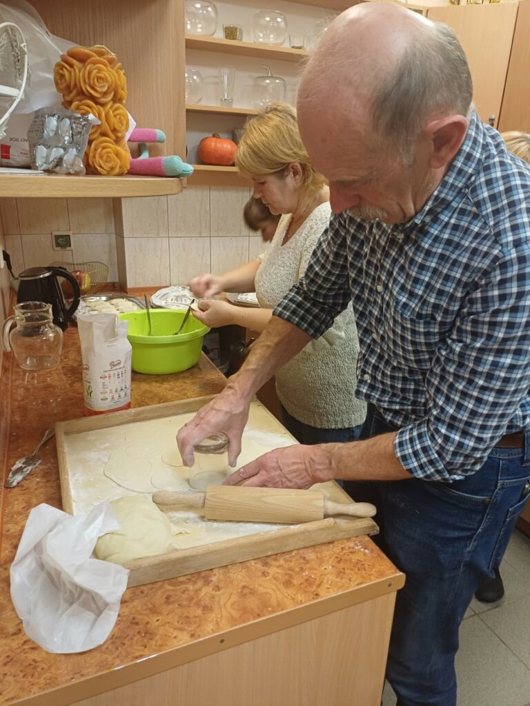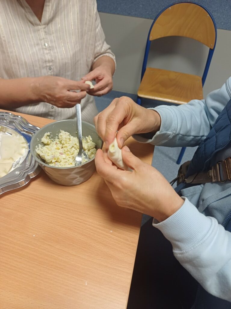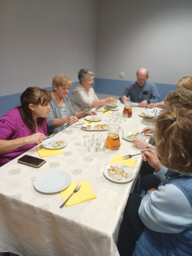 Uczestnicy mieli okazję poznać cały proces ich przygotowania – od wyrabiania ciasta, przez lepienie, aż po gotowanie i, oczywiście, wspólną degustację. Wśród gotujących znalazł się również jeden pan, który z zaangażowaniem pomagał przy wyrabianiu ciasta i chętnie dzielił się swoim kulinarnym doświadczeniem. 👨‍🍳