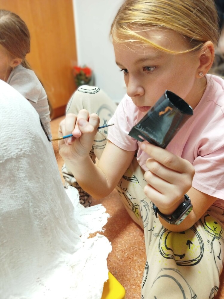 Zajęcia przebiegały w twórczej atmosferze pełnej śmiechu i skupienia, a dzieci z dumą prezentowały swoje gotowe duchy. Takie warsztaty to doskonały sposób na rozwijanie kreatywności i wspólne spędzanie czasu w radosnym, jesiennym nastroju.