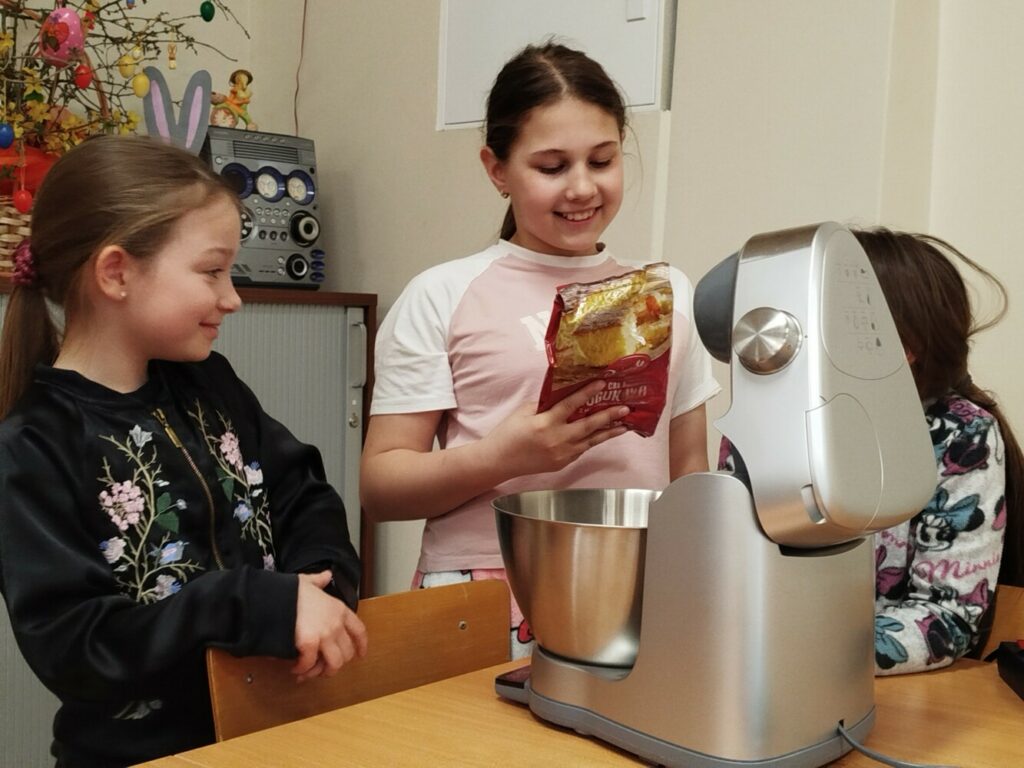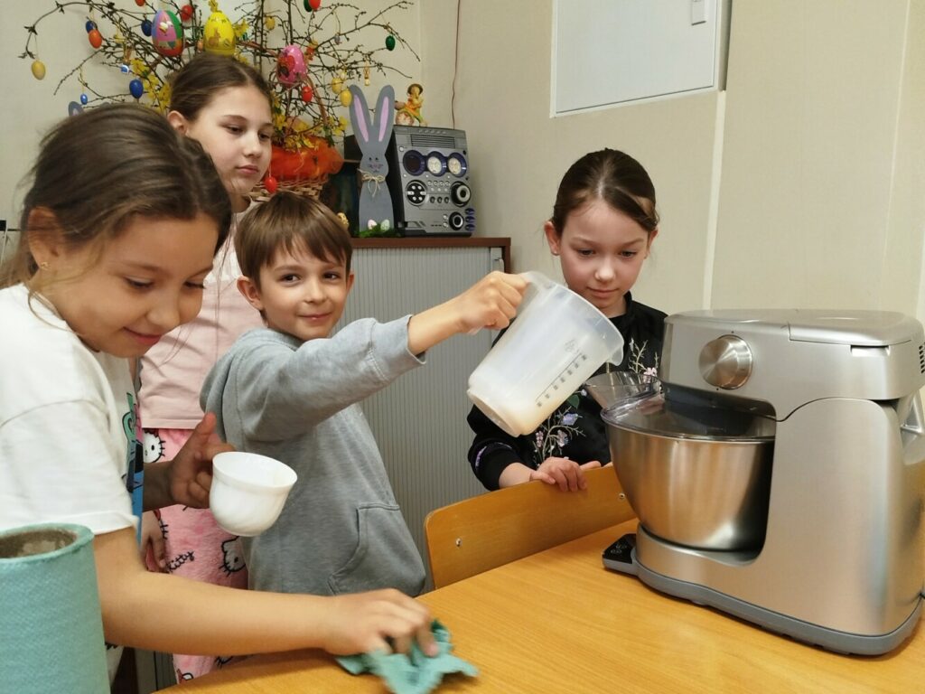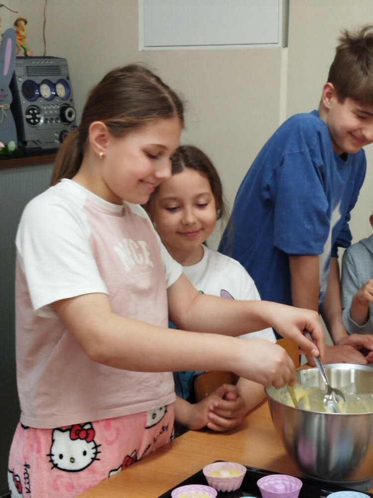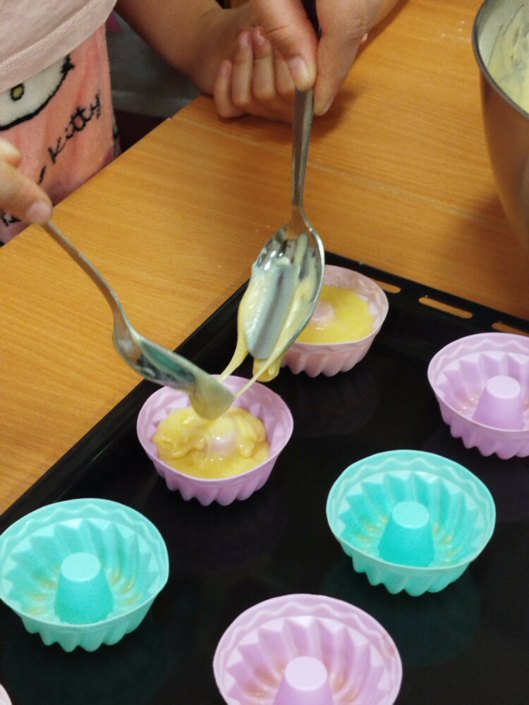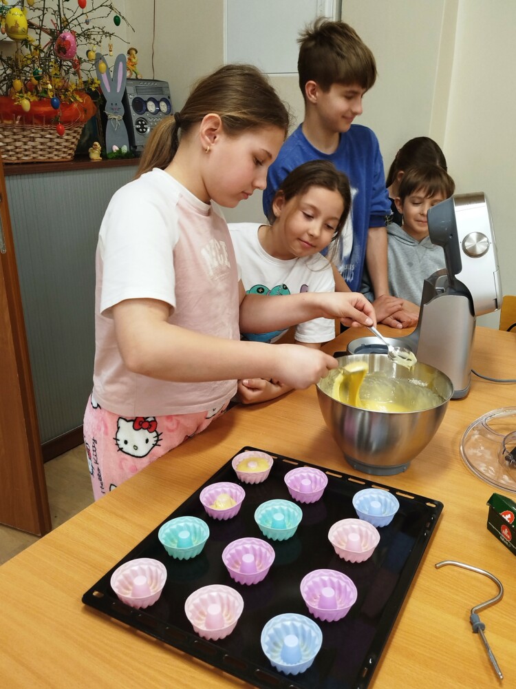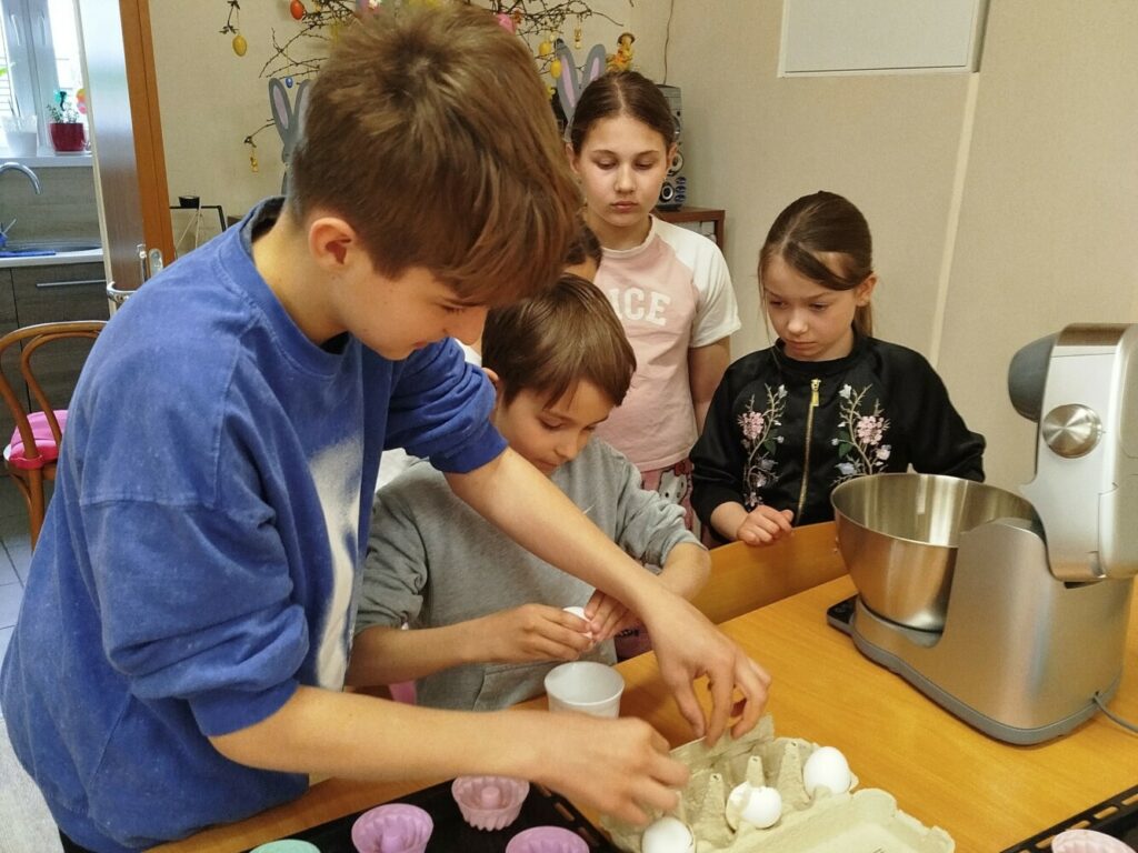 Podczas zajęć dzieci samodzielnie odmierzały składniki, mieszały ciasto i obserwowały cały proces przygotowania wypieków. Warsztaty kulinarne były nie tylko świetną zabawą, ale także okazją do nauki współpracy, rozwijania samodzielności oraz poznawania podstaw pieczenia.