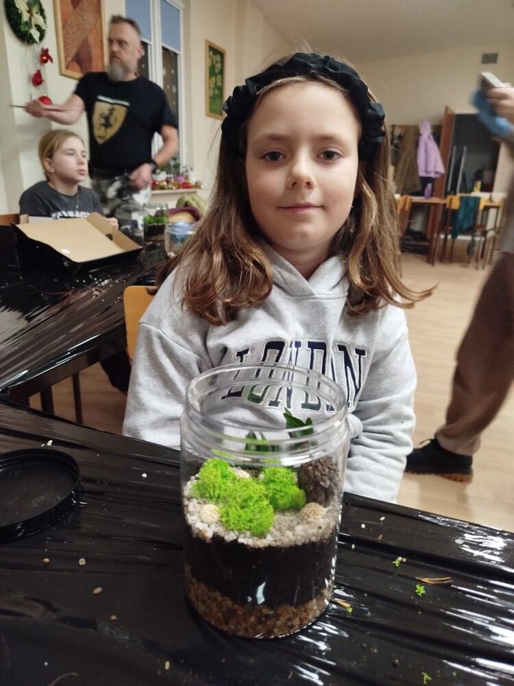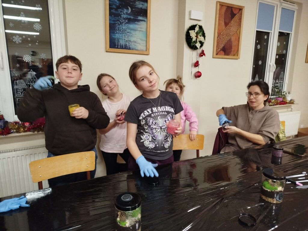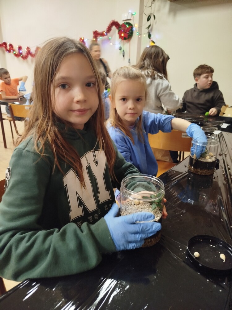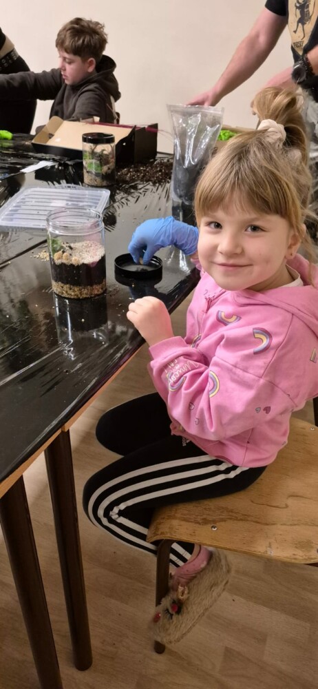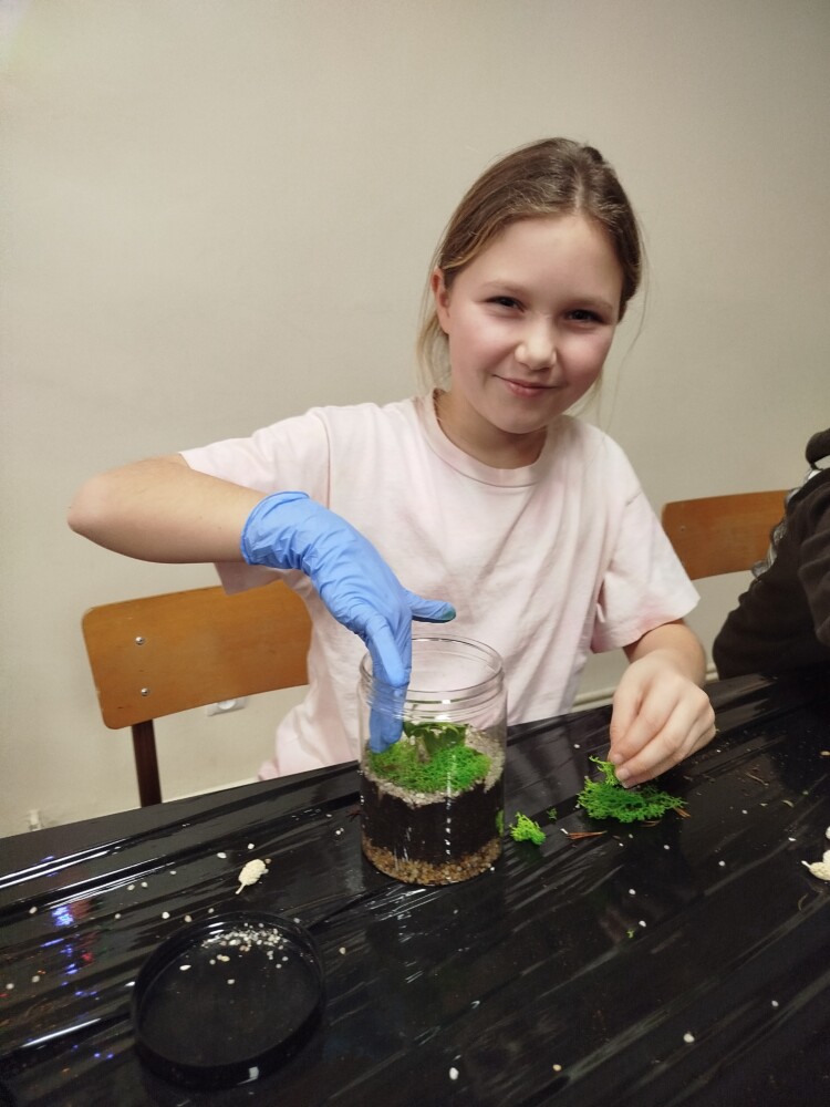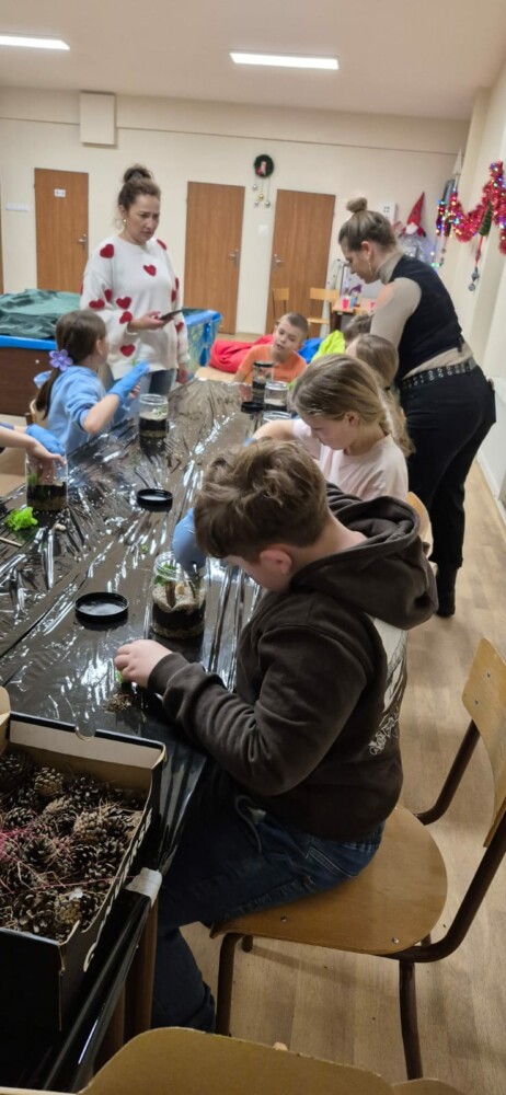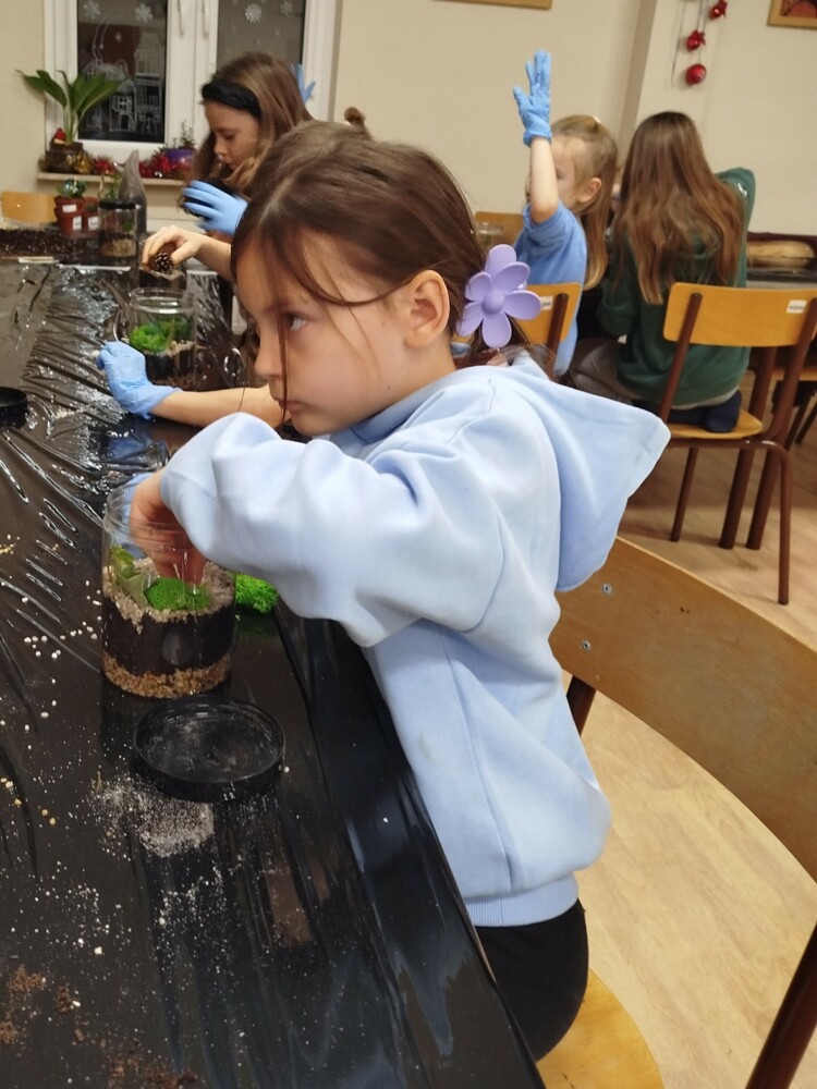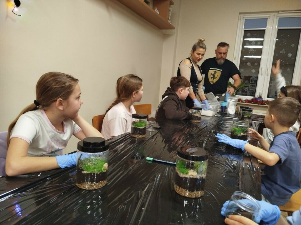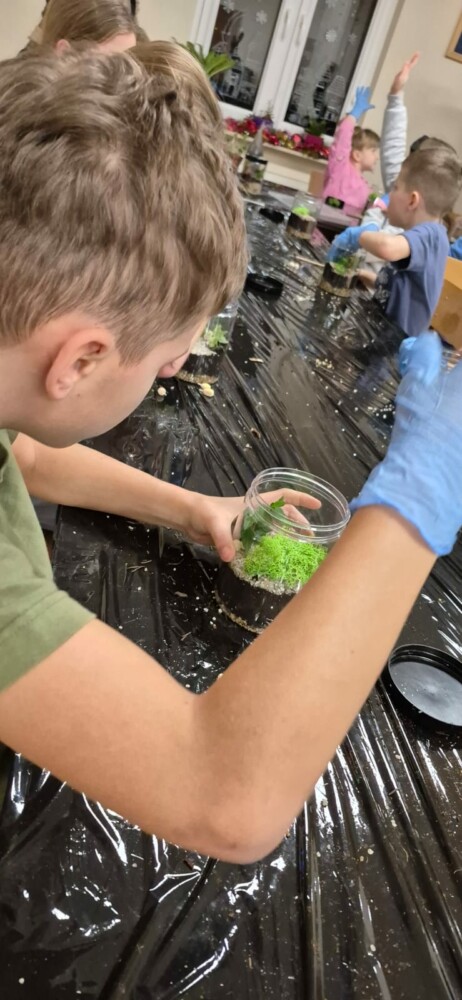 Podczas zajęć uczestnicy wykonywali lasy w słoikach, ucząc się w praktyce, jak działają rośliny oraz dlaczego warto wprowadzać zieleń do przestrzeni domowej. Warsztaty miały charakter praktyczny i kreatywny, dzięki czemu dzieci mogły samodzielnie doświadczyć, że edukacja ekologiczna może być ciekawa i angażująca.
