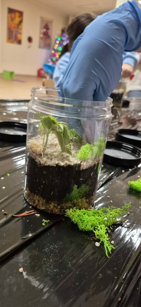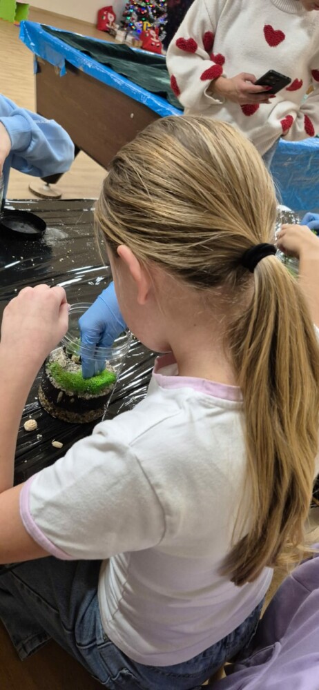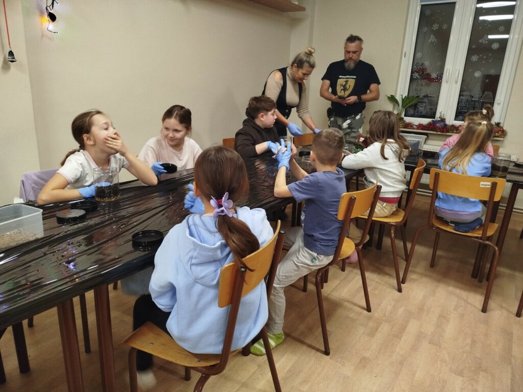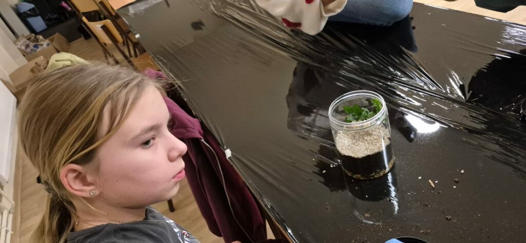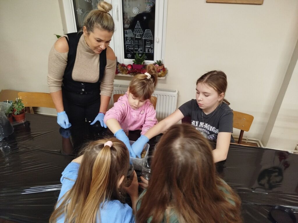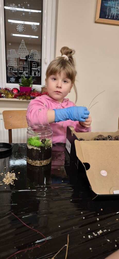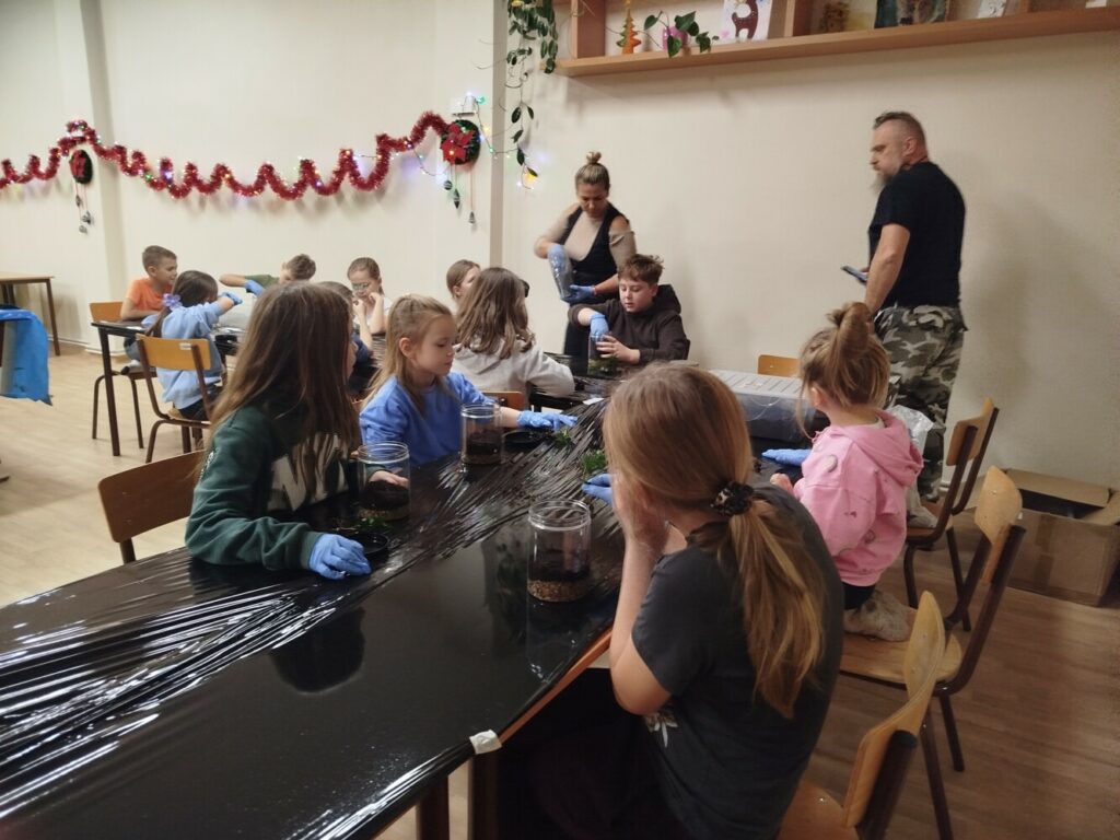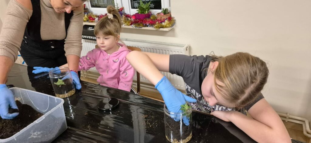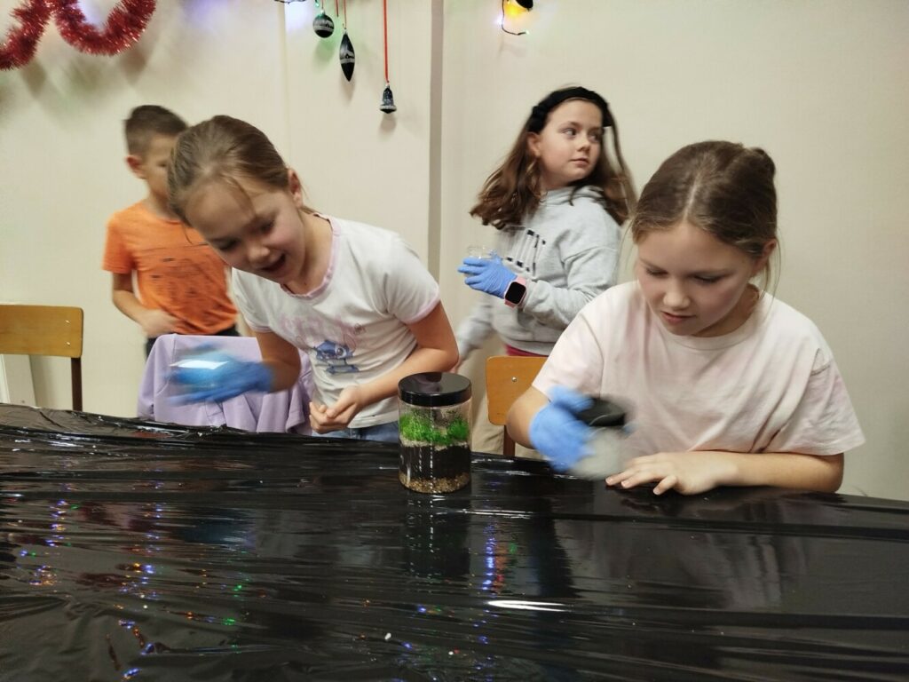 Podczas zajęć uczestnicy wykonywali lasy w słoikach, ucząc się w praktyce, jak działają rośliny oraz dlaczego warto wprowadzać zieleń do przestrzeni domowej. Warsztaty miały charakter praktyczny i kreatywny, dzięki czemu dzieci mogły samodzielnie doświadczyć, że edukacja ekologiczna może być ciekawa i angażująca.