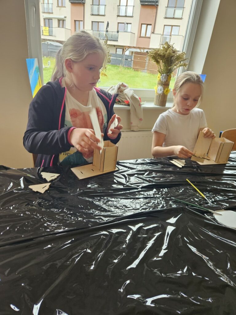 Najpierw dzieci dopasowywały elementy, by stworzyć stabilną konstrukcję, później starannie je sklejały, a na końcu przychodziła najprzyjemniejsza część – malowanie i ozdabianie. 🎨