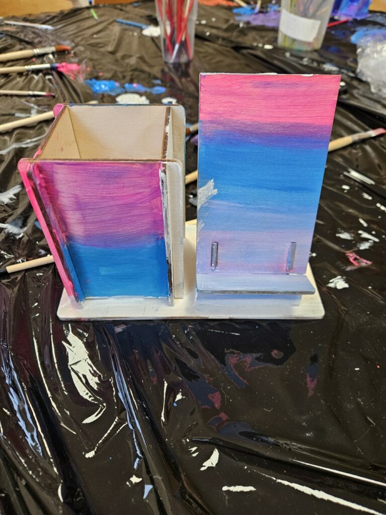 Podczas warsztatów plastycznych każdy uczestnik własnoręcznie złożył, skleił i pomalował drewniany organizer na biurko. To zadanie wymagało nie tylko wyobraźni, ale też precyzji i cierpliwości — i wszyscy poradzili sobie znakomicie! 💪👏
