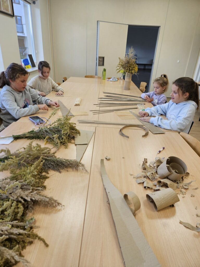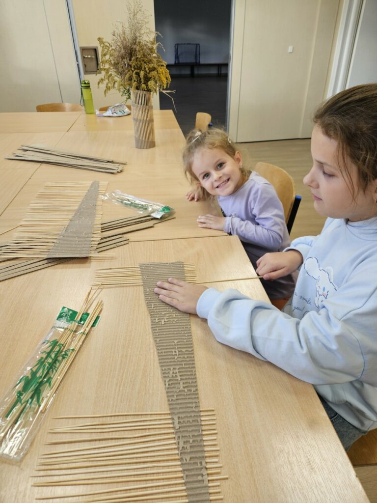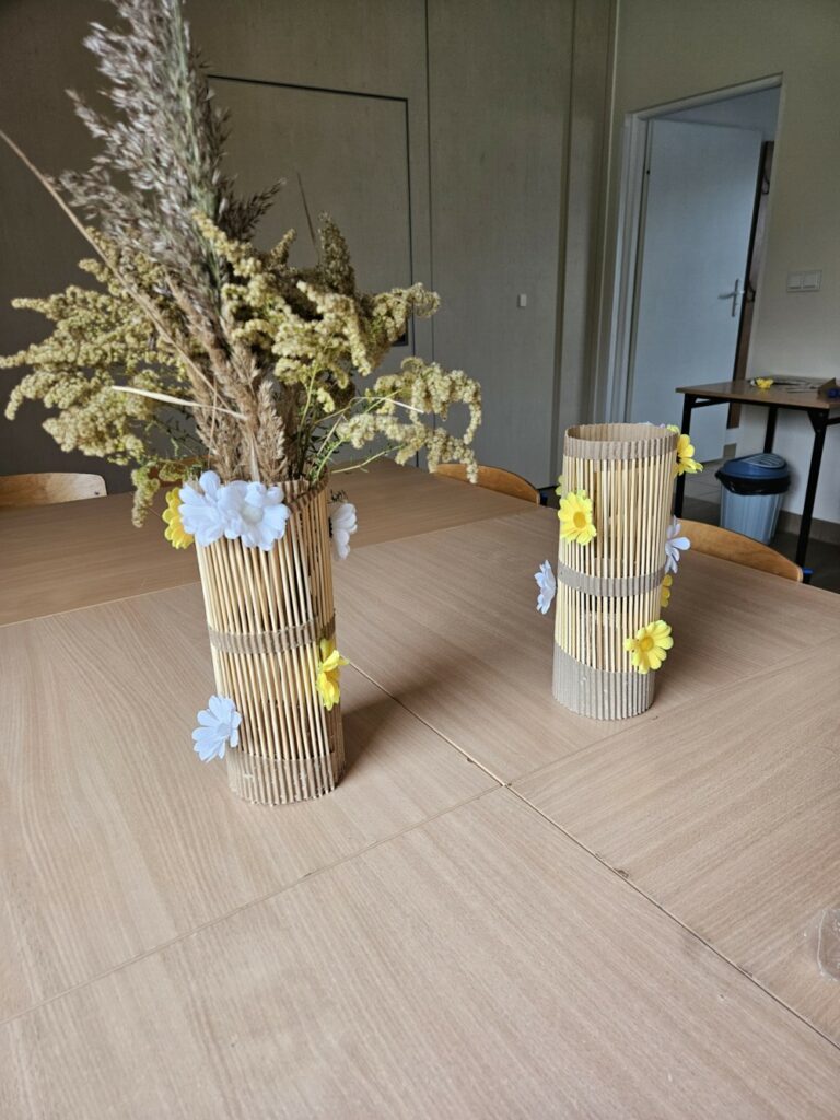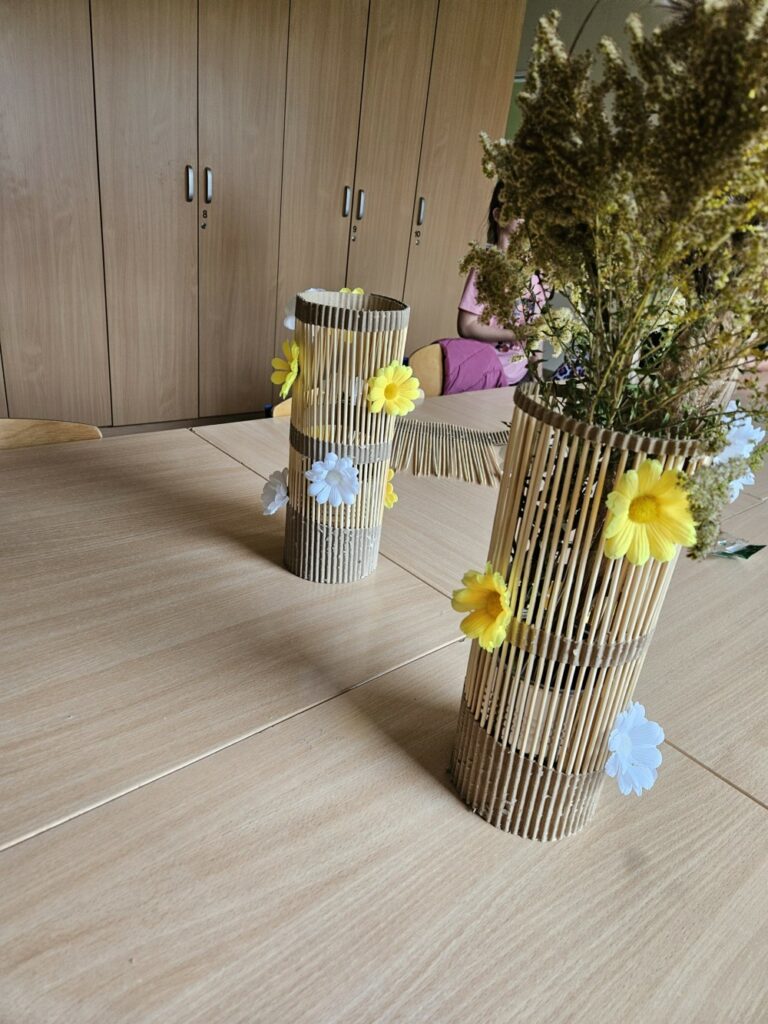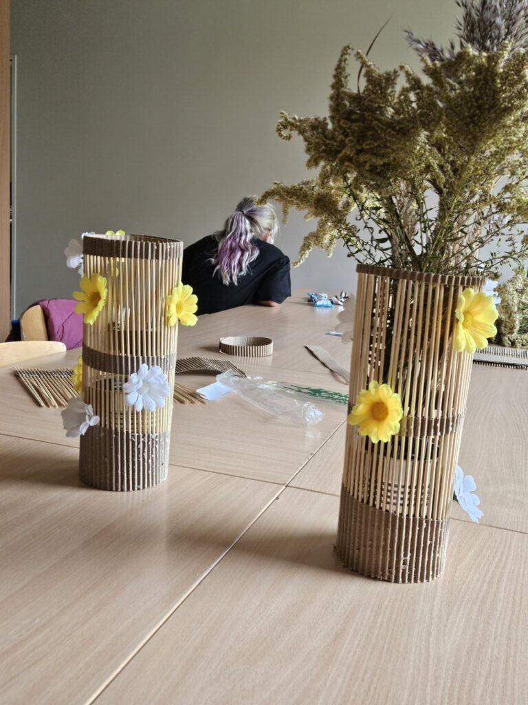 Po powrocie przeszliśmy do części warsztatowej. W ruch poszły bambusowe patyczki, karton, klej i oczywiście ogromna dawka wyobraźni! Tworzyliśmy własnoręczne wazony — lekkie, naturalne i pełne charakteru. Każdy z nich ozdobiony został kwiatami, które dodają im radości i koloru 🌻