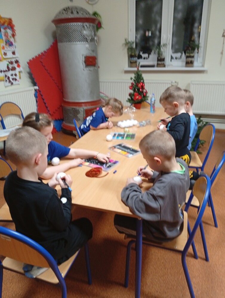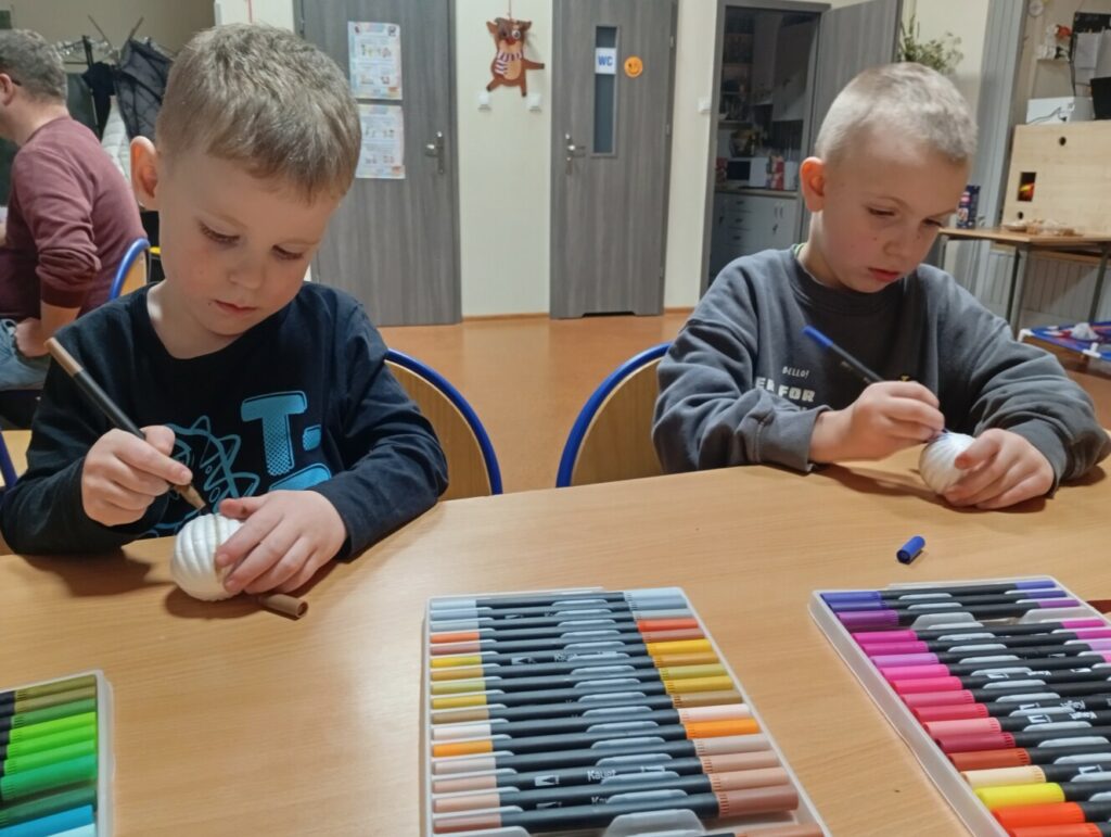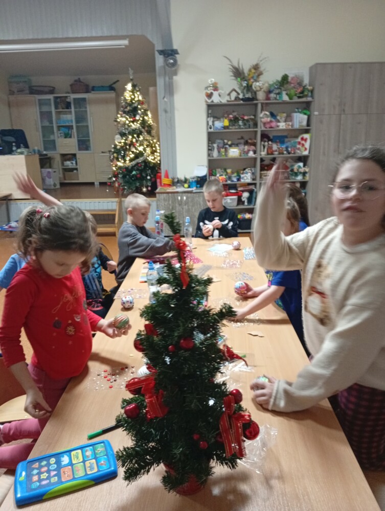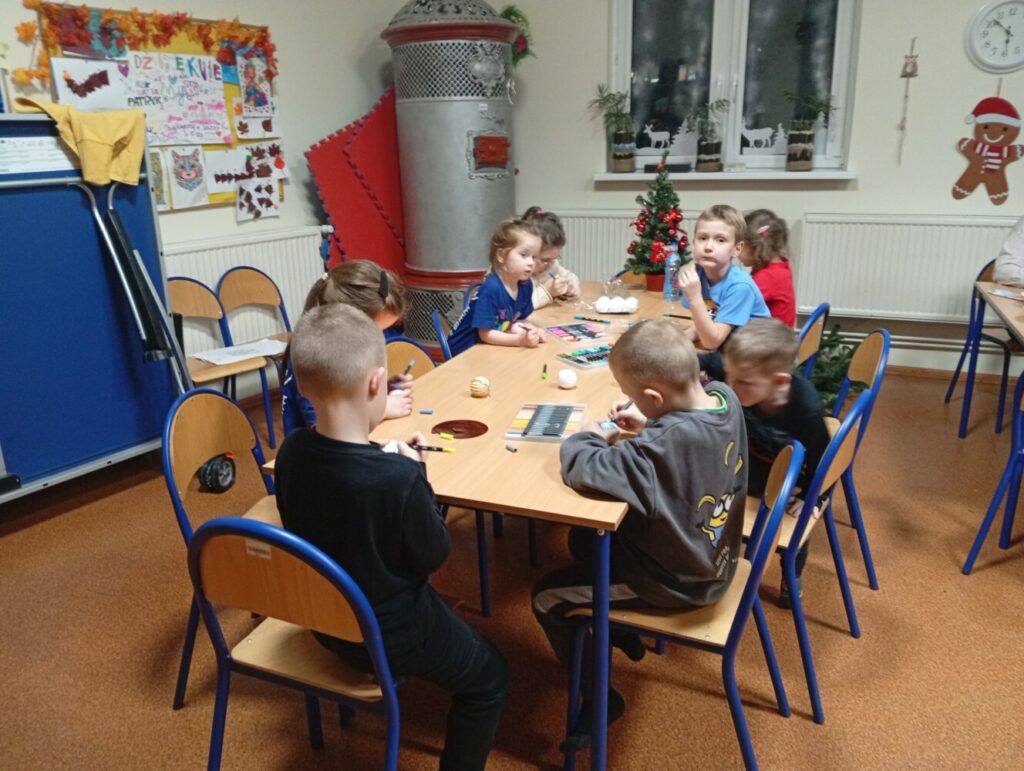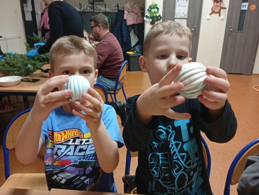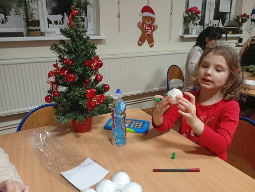 Podczas warsztatów artystycznych dzieci z ogromnym zaangażowaniem i radością tworzyły piękne, kolorowe bombeczki. W tle rozbrzmiewały świąteczne piosenki, które wprowadziły wszystkich w magiczny, bożonarodzeniowy nastrój 🎶🎅