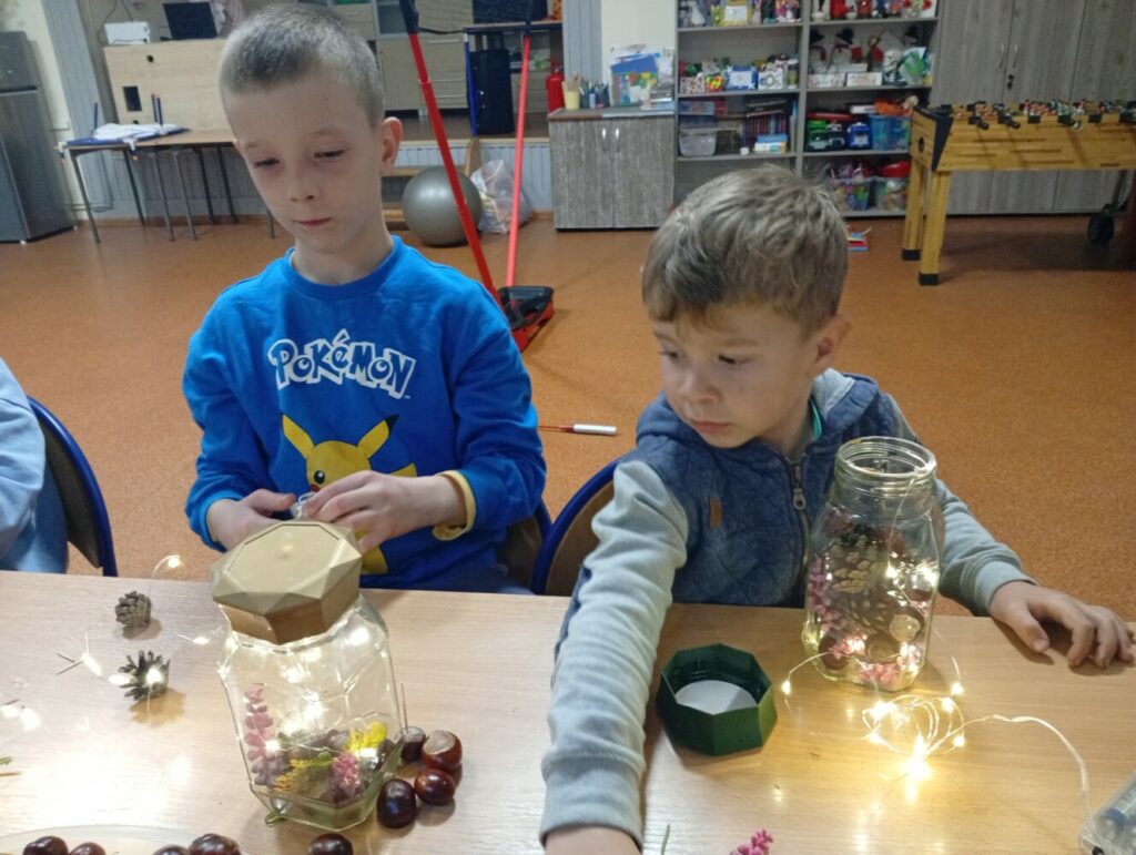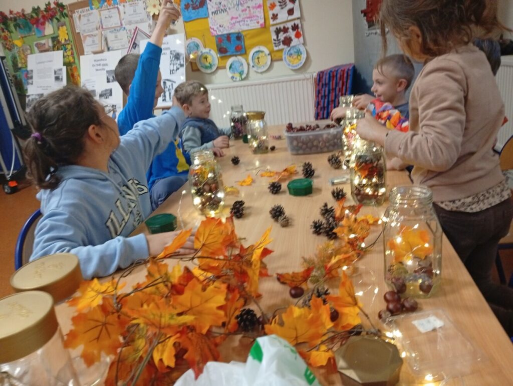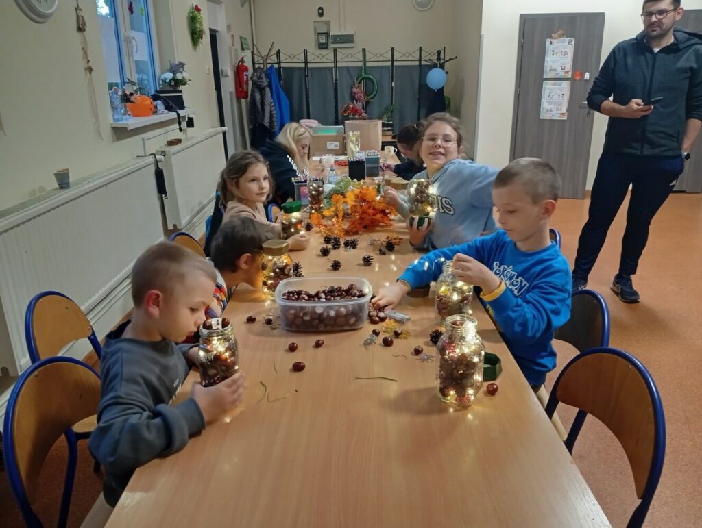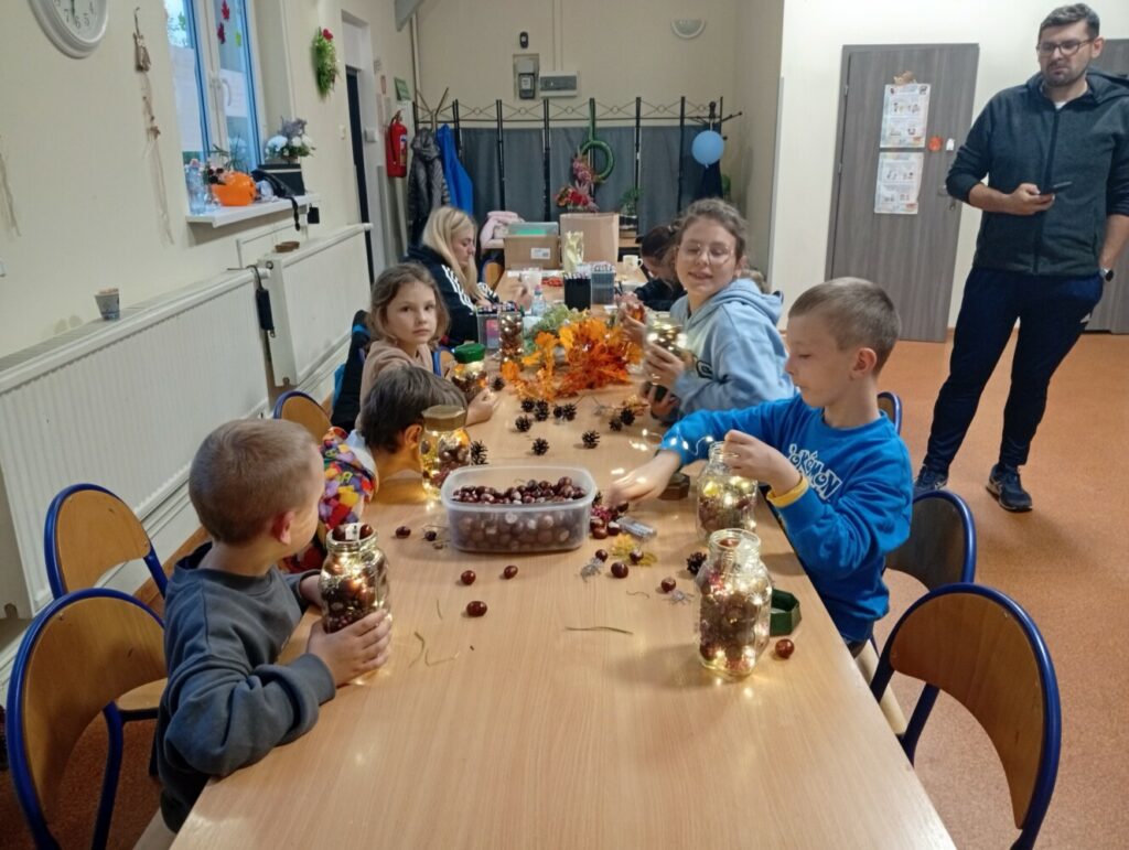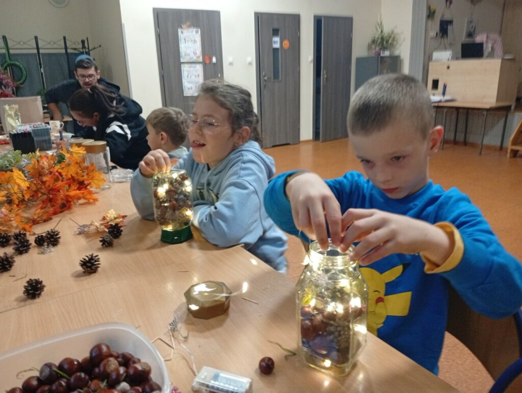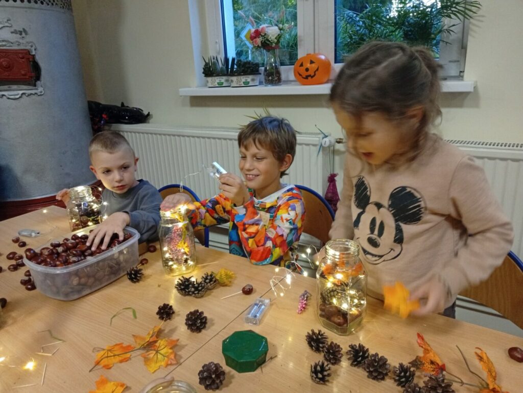 Dzieci z Klubu w Wąwelnicy w pełni poczuły jej magiczny klimat 🌰🍁🌟. Z jesiennych darów – kolorowych liści, żołędzi, kasztanów i pachnących szyszek – wyczarowały przepiękne jesienne lampki, które rozświetlą długie wieczory i przypomną o urokach tej pory roku.